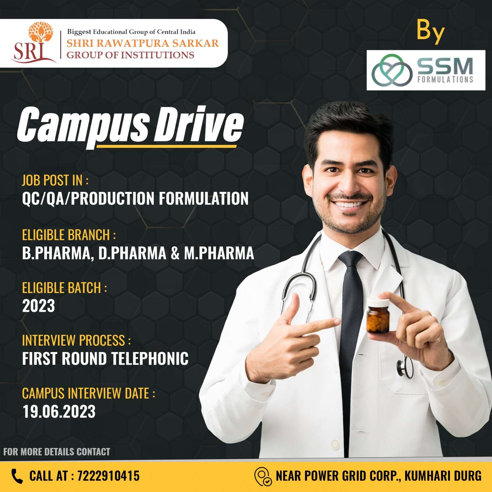 फार्मेसी कुम्हारी प्लेसमेंट इंचार्ज आस्था वर्मा , फार्मेसी जबलपुर प्लेसमेंट इंचार्ज डॉ दिलेन्द्र, फार्मेसी चित्रकूट प्लेसमेंट इंचार्ज मनीषा ने बताया एस एस एम फार्मूलेशन प्राइवेट लिमिटेड एक ड्रग्स मैन्युफैक्चरिंग कंपनी है जिसका हेड क्वार्टर नागपुर में है कंपनी लगभग सभी प्रकार की दवाये उपलब्ध करने के लिए कार्यरत है।