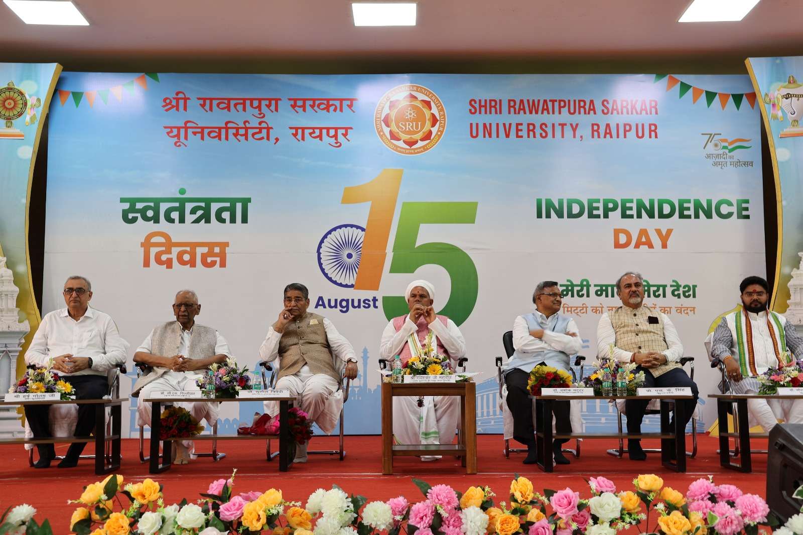 कुलाधिपति अनंत श्री विभूषित श्री रविशंकर जी महाराज ने उपस्थित सभी सदस्यों एवं विद्यार्थयों को स्वतंत्रता दिवस की बधाई दी और उन्होंने कहा की आदरणीय डॉ. सुशील त्रिवेदी जी , डॉ. अशोक भट्टर साहब, प्रो. सी. एस. पिल्लीवार ने जो हमे मार्गदर्शन दिया बहुत अच्छा लगा आपका जो बताया हुआ और अपने जो हमे पथ दिया, रास्ता बनाया है उस पे हम जरूर चलेंगे। आज हम स्वतंत्रता दिवस के अवसर पर हम स्वतंत्रता सैनानी के चरणों में वंदन करते है उनसे प्रार्थना करते है की हमको सदा विश्वास और धैर्य और सद्बुद्धि बनी रहे जिससे हम उनके विचारों को लेके के चल सके और बीजारोपण कर सके। उन्होंने कहा की विश्वविद्यालय के प्रति कुलाधिपति गौतम जी, कुलपति एस.के. सिंह, कुलसचिव, प्रोफेसर एवं छात्र और छात्राएं आप अंधेरे को प्रकाश बदलने का प्रयास कर रहे हैं। हमेशा परिश्रम करें परिश्रम के बिना कुछ नही हो सकता हैं परिश्रम अध्यात्म में भी है, पढ़ाई में भी, कृति में भी, बिजनेस में भी, समाज सेवा में हमेशा जागृत अवस्था में रहे, खूब परिश्रम करे, पॉजिटिव रहे, नर्म रहे, सरल रहे और सुनने की क्षमता को हमेशा धारण करे।