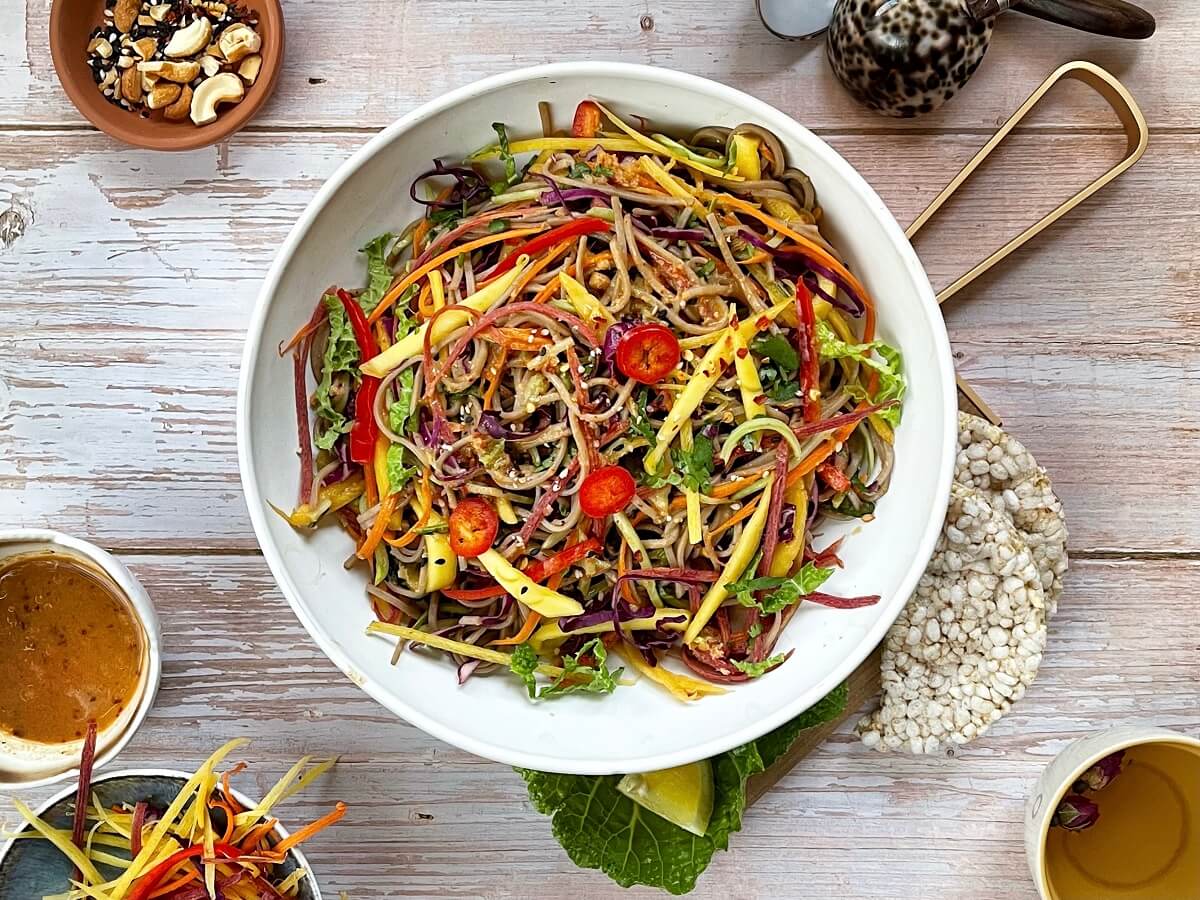 सामग्री :- लहसुन कटा हुआ-1 छोटा चम्मच नमक- स्वादानुसार पाउडर्ड गुड़- 3 बड़े चम्मच अदरक कटा हुआ-2 टी स्पून नींबू का रस- 3 बड़े चम्मच सोया सॉस (लाइट) – 2 बड़े चम्मच चिली सॉस-1 बड़ा चम्मच पीनट बटर- 1 बड़ा चम्मच तिल का तेल-1 बड़ा चम्मच सलाद के लिए स्लाइस किया हुआ मैंगो-2 कप कैबेज -1 कप शिमला मिर्च स्लाइस की हुई- ½ कप पर्पल कैबेज – 1कप कच्चा पपीता – 1 कप गाजर पतली लंबी कटी हुई – 1 कप हरे प्याज़ कटा हुआ- ½ कप पुदीने की पत्तियां- मुट्ठी भर 2 बड़े चम्मच नींबू का रस तिल (भुने हुए) – 1 बड़ा चम्मच