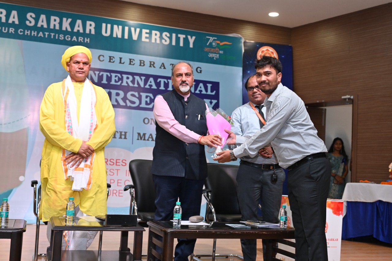 इसी दौरान विश्वविद्यालय के कुलपति डॉ. प्रताप सिंह ने रविशंकर महाराज जी को सादर नमन करते हुए कहा कि अंतरराष्ट्रीय नर्स दिवस के आयोजन पर हमारा उद्देश्य है कि हम नर्सेज को सम्मान दें। आज हम अंतर्राष्ट्रीय नर्स दिवस से जुड़े वैश्विक स्वास्थ्य को सुरक्षित रखने के अधिकार को सम्मान करने के उद्देश्य से एकत्रित हुए हैं । नर्सिंग मानव समाज को देखभाल और स्नेह के बंधन से बनता है एवं देखभाल के साथ-साथ मार्मिक कहानियां और चुनौतियों के बीच एक सेतु का कार्य करता है नर्सिंग का दायरा एक अस्पताल तक ही सीमित नहीं बल्कि एक नर्स पूरे विश्व में मानव जाति को बचाने में सबसे ज्यादा योगदान देती है।