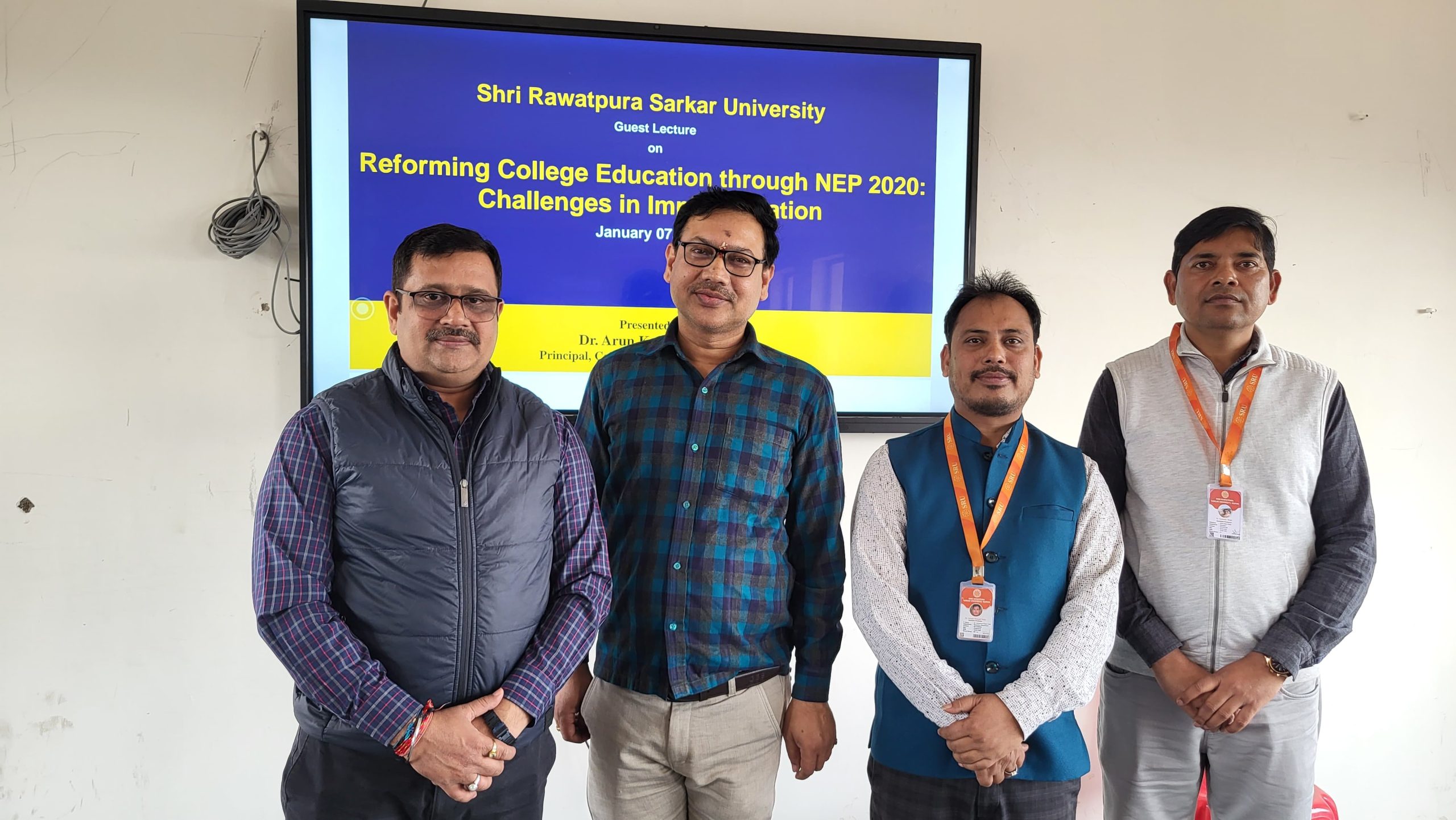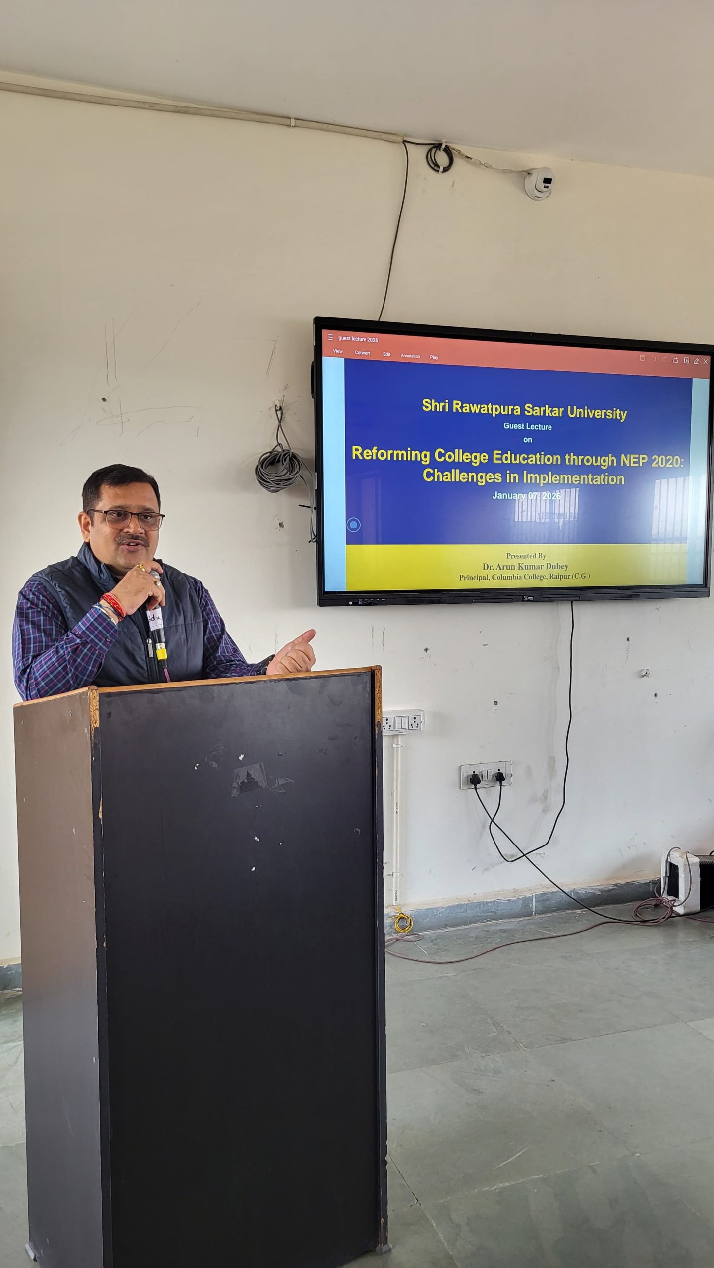रायपुर। श्री रावतपुरा सरकार विश्वविद्यालय के शिक्षा विभाग ने राष्ट्रीय शिक्षा नीति (NEP-2020) पर एक विशेष व्याख्यान का आयोजन किया। “NEP 2020 के माध्यम से कॉलेज शिक्षा में सुधार: कार्यान्वयन में चुनौतियां” विषय पर आयोजित इस कार्यक्रम में मुख्य वक्ता कोलंबिया कॉलेज ऑफ एजुकेशन, रायपुर के प्राचार्य प्रोफेसर डॉ अरुण कुमार दुबे थे।