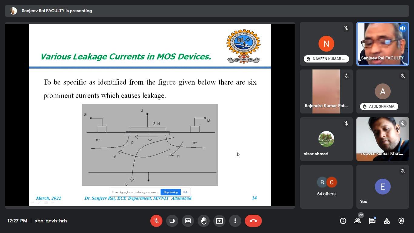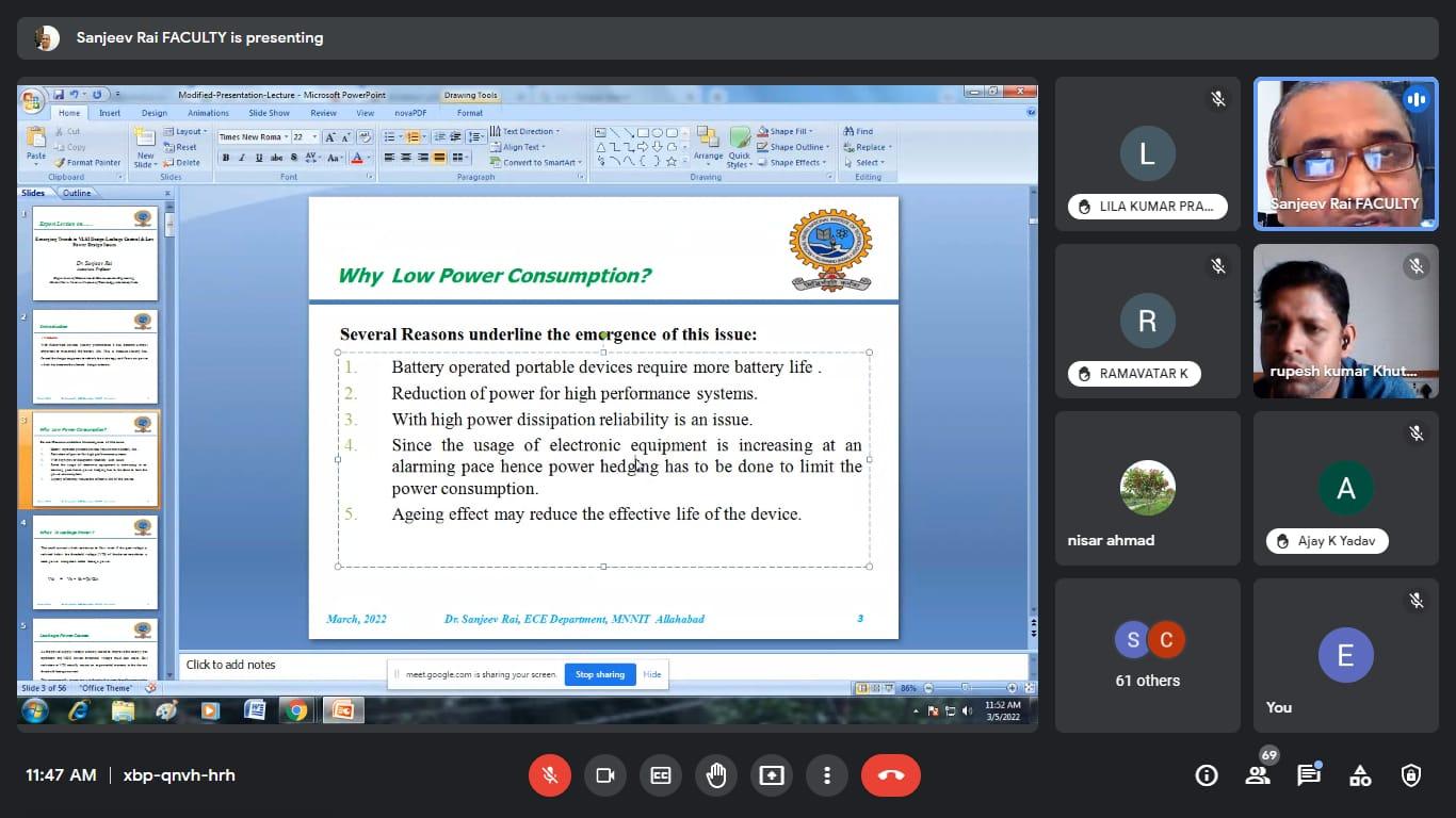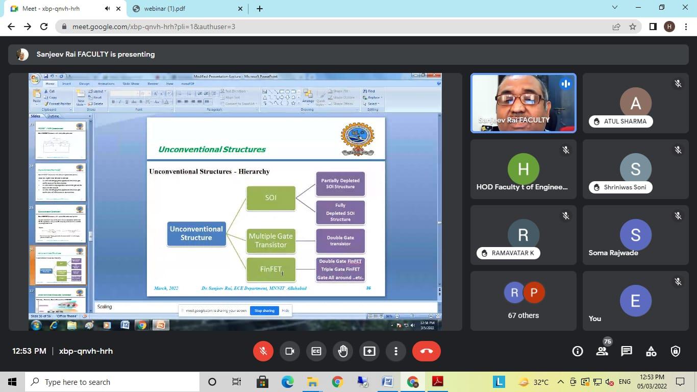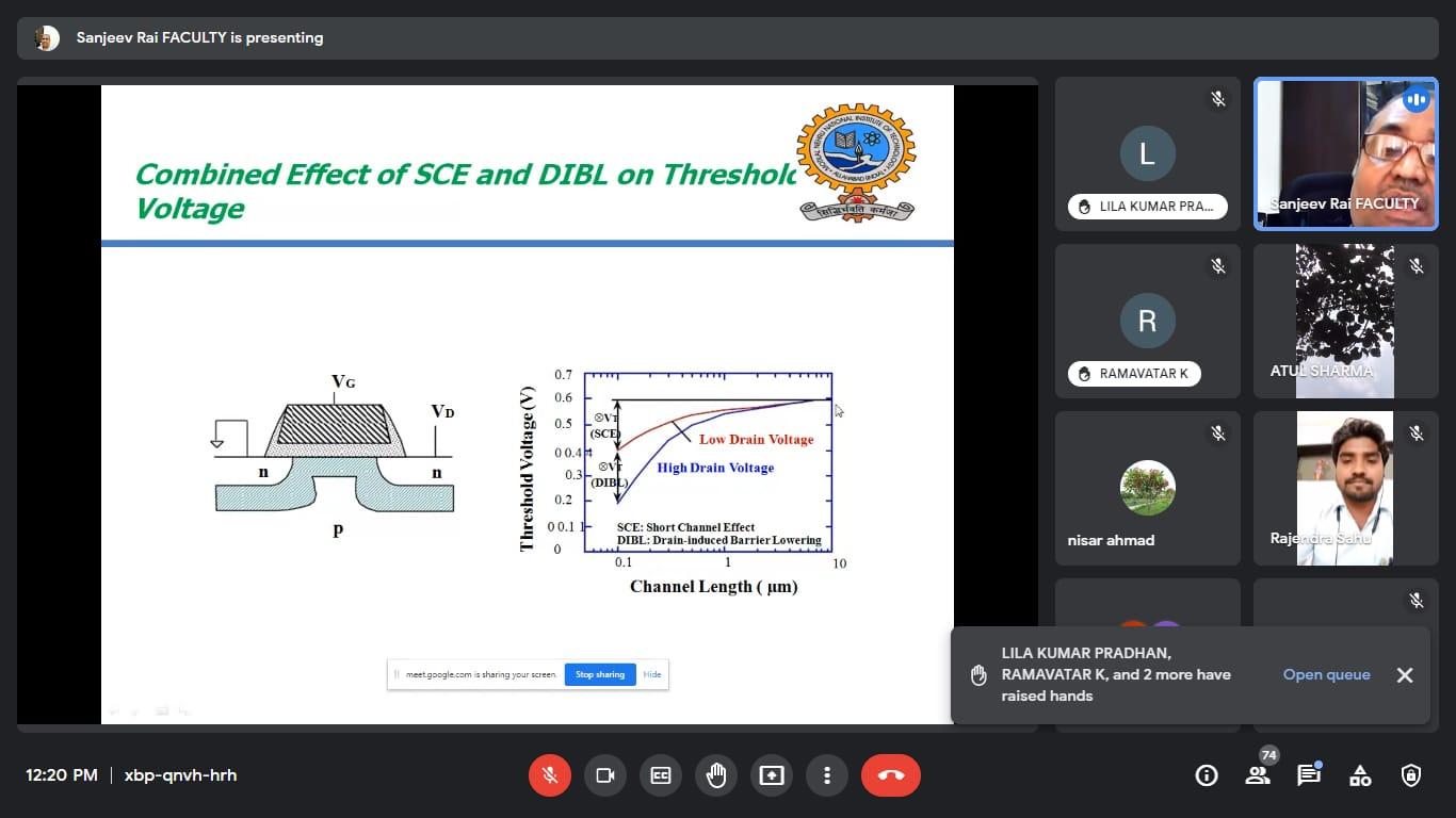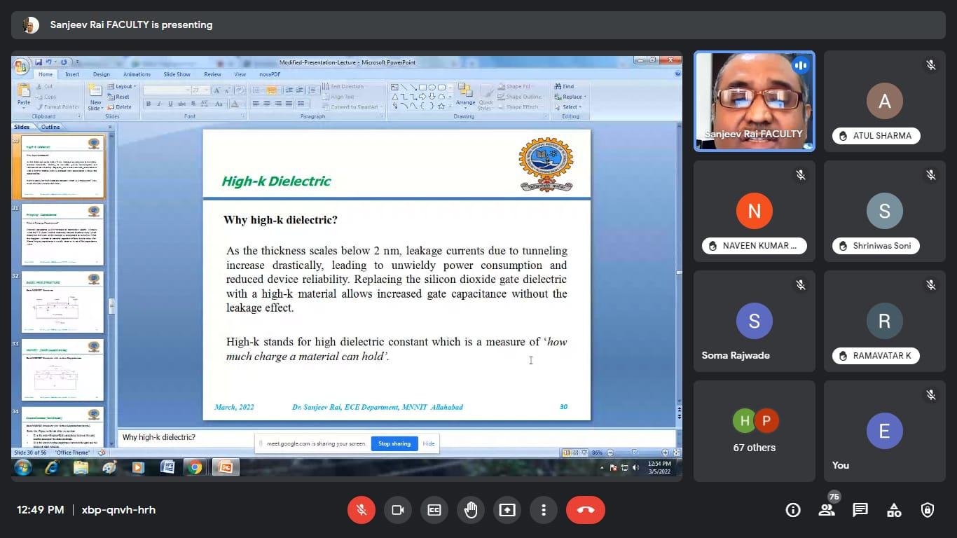 इस वेबिनार में मुख्य वक्ता के रूप में डॉ. संजीव राय जो वर्तमान में प्रयागराज के मोतीलाल नेहरू राष्ट्रीय प्रौद्योगिकी संस्थान में इलेक्ट्रॉनिक्स और संचार इंजीनियरिंग ( MNNIT) विभाग में एसोसिएट प्रोफेसर के रूप में कार्यरत हैं। वेबिनार में पावर लीकेज, पावर कंजप्शन एवं उपकरणों में लघु चैनल का प्रभाव पर विस्तार से चर्चा की ।