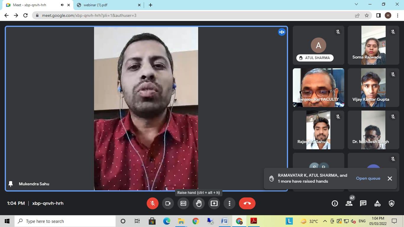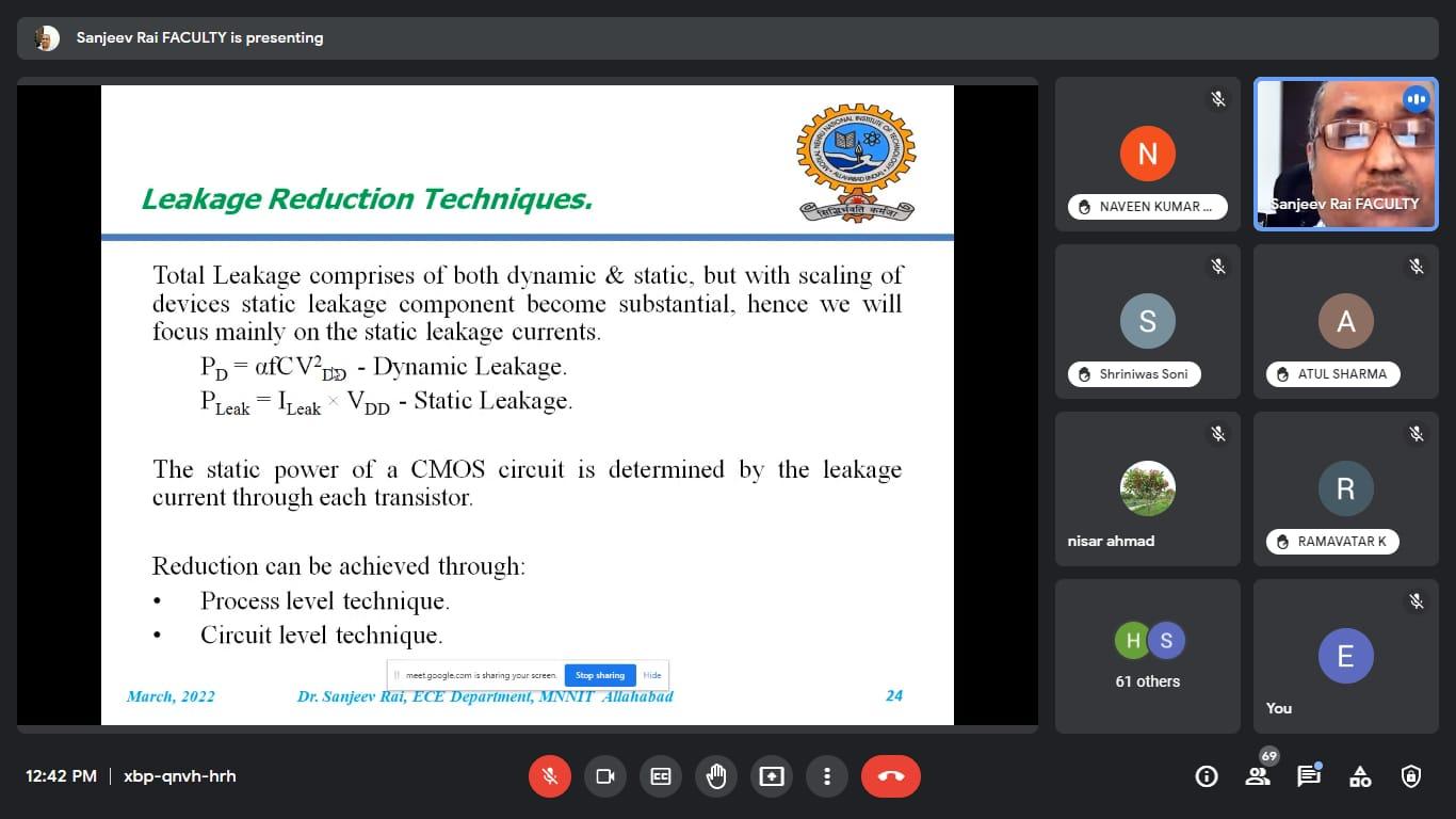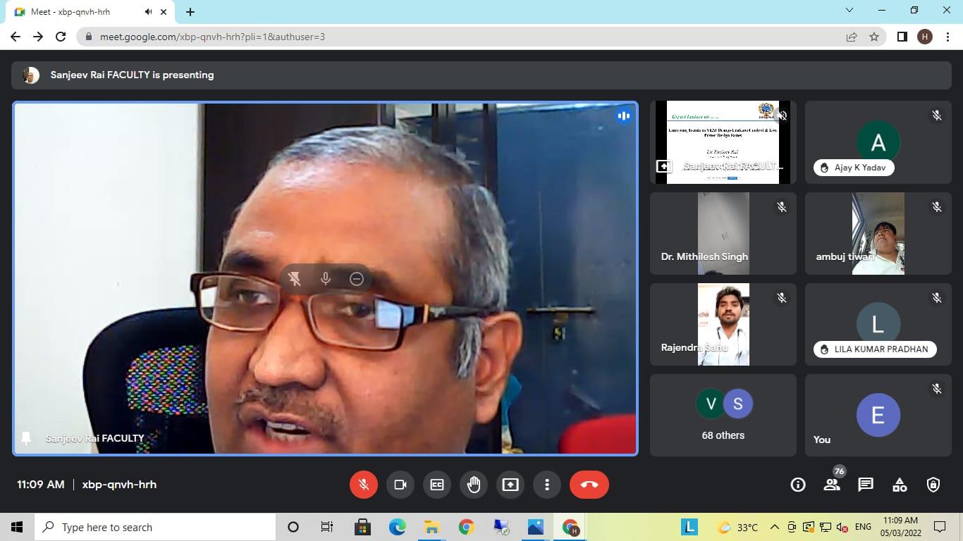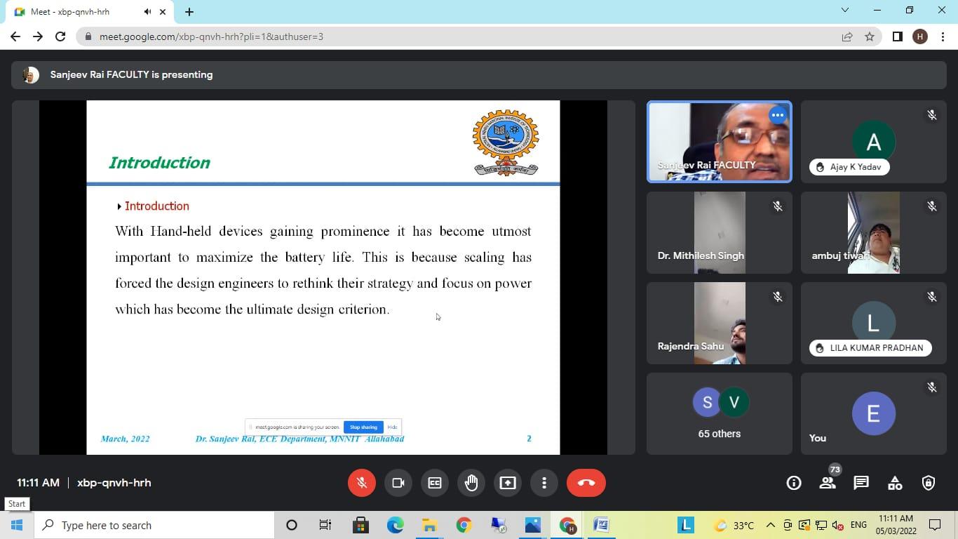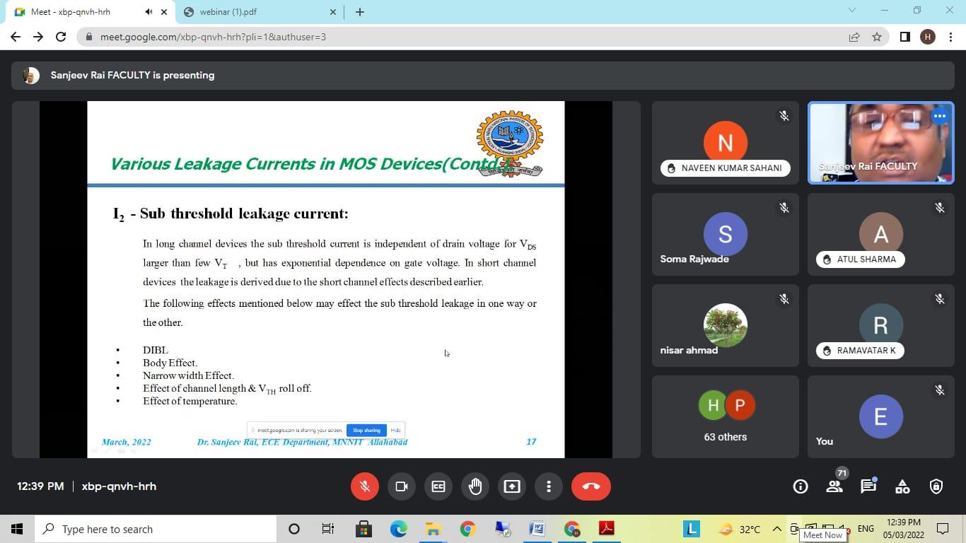 इस वेबिनार में मुख्य वक्ता के रूप में डॉ. संजीव राय जो वर्तमान में प्रयागराज के मोतीलाल नेहरू राष्ट्रीय प्रौद्योगिकी संस्थान में इलेक्ट्रॉनिक्स और संचार इंजीनियरिंग ( MNNIT) विभाग में एसोसिएट प्रोफेसर के रूप में कार्यरत हैं। वेबिनार में पावर लीकेज, पावर कंजप्शन एवं उपकरणों में लघु चैनल का प्रभाव पर विस्तार से चर्चा की ।
